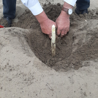 Wit in de grond, als hij net boven komt wordt de top door het zonlicht Paars. Vervolgens doorgroeiend naar de groene asperges