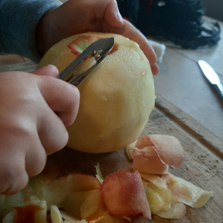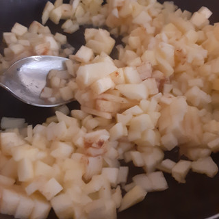 Appel schillen, in kleine blokjes snijden en bakken met klontje boter en kruiden met de kaneel en de honing. Laten afkoelen