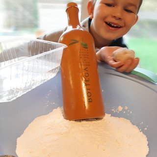 Strooi de bloem uit op je werkblad en maak een kuiltje. Meng de olijfolie en het zout erdoor. Los de verse gist op in het water. Giet het gistmengsel bij de bloem. Kneed het mengsel met de hand tot een homogeen en glad, soepel deeg.