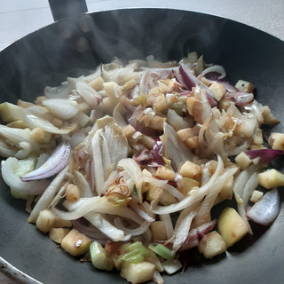 Gesneden appel, rode ui, jonge ui, witloof en grillworst aanstoven en afkruiden. Eventueel koffielepel honing toevoegen.