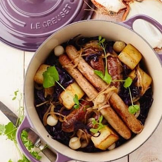 • Stoof de ui aan, zonder te kleuren, en voeg dan de rode kool toe.